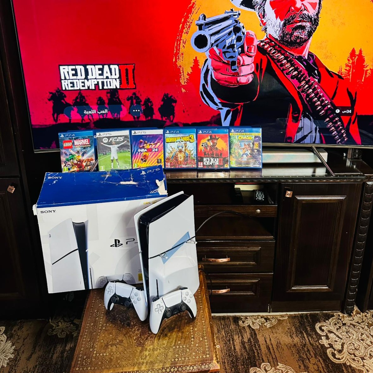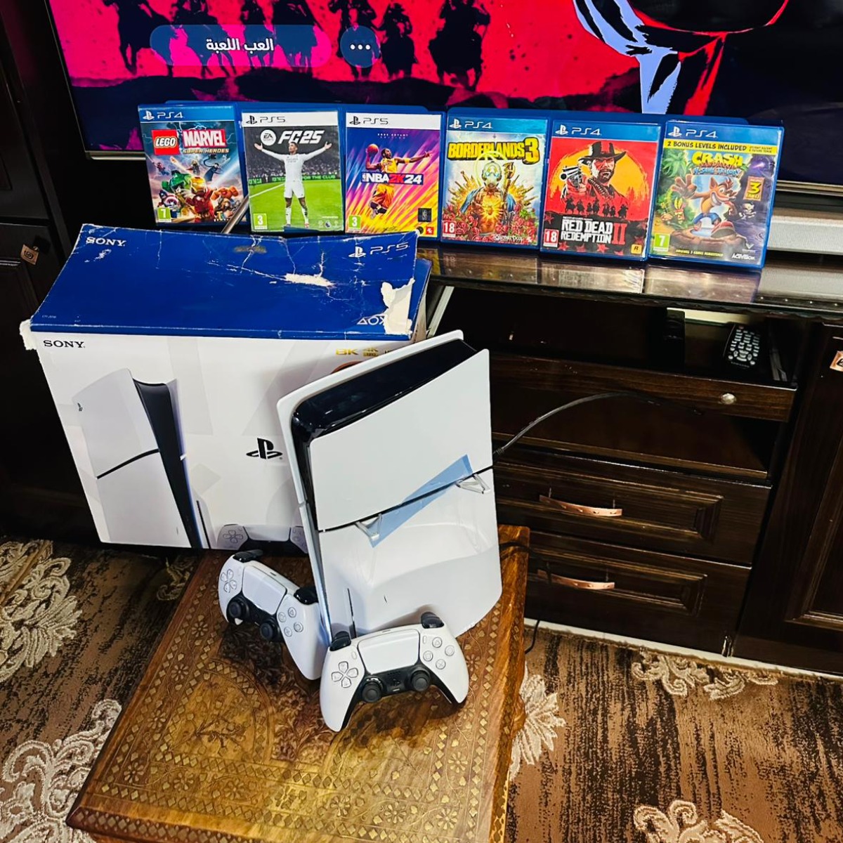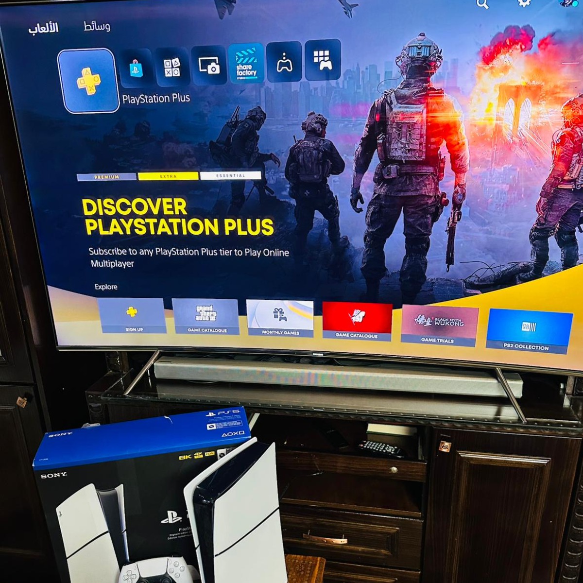 Playstation 5 Slim Blueray , 1TB , ايدتين أصليات , 6 سيديات العاب + العاب على نفس الجهاز , شبه جديدة غير مفتوحة أو مصلحة, شامل الكرتونة وجميع الكوابل الاصلية