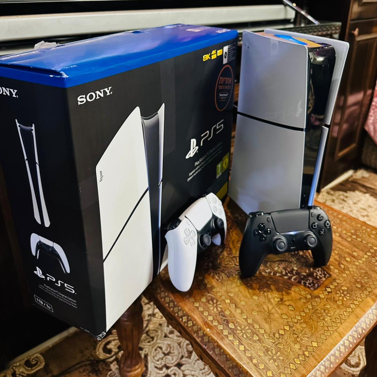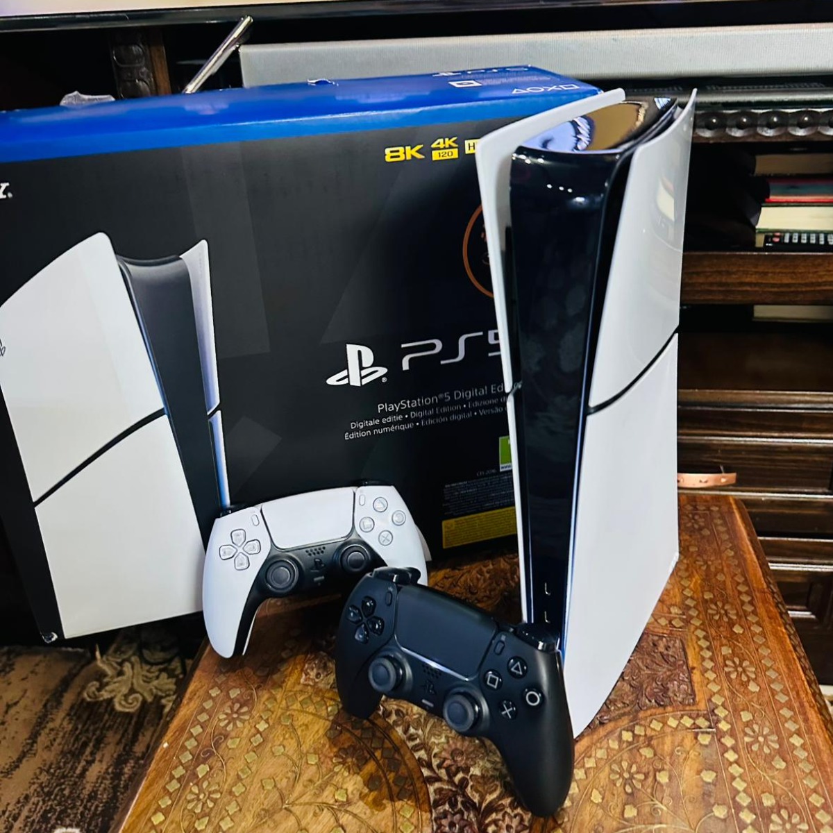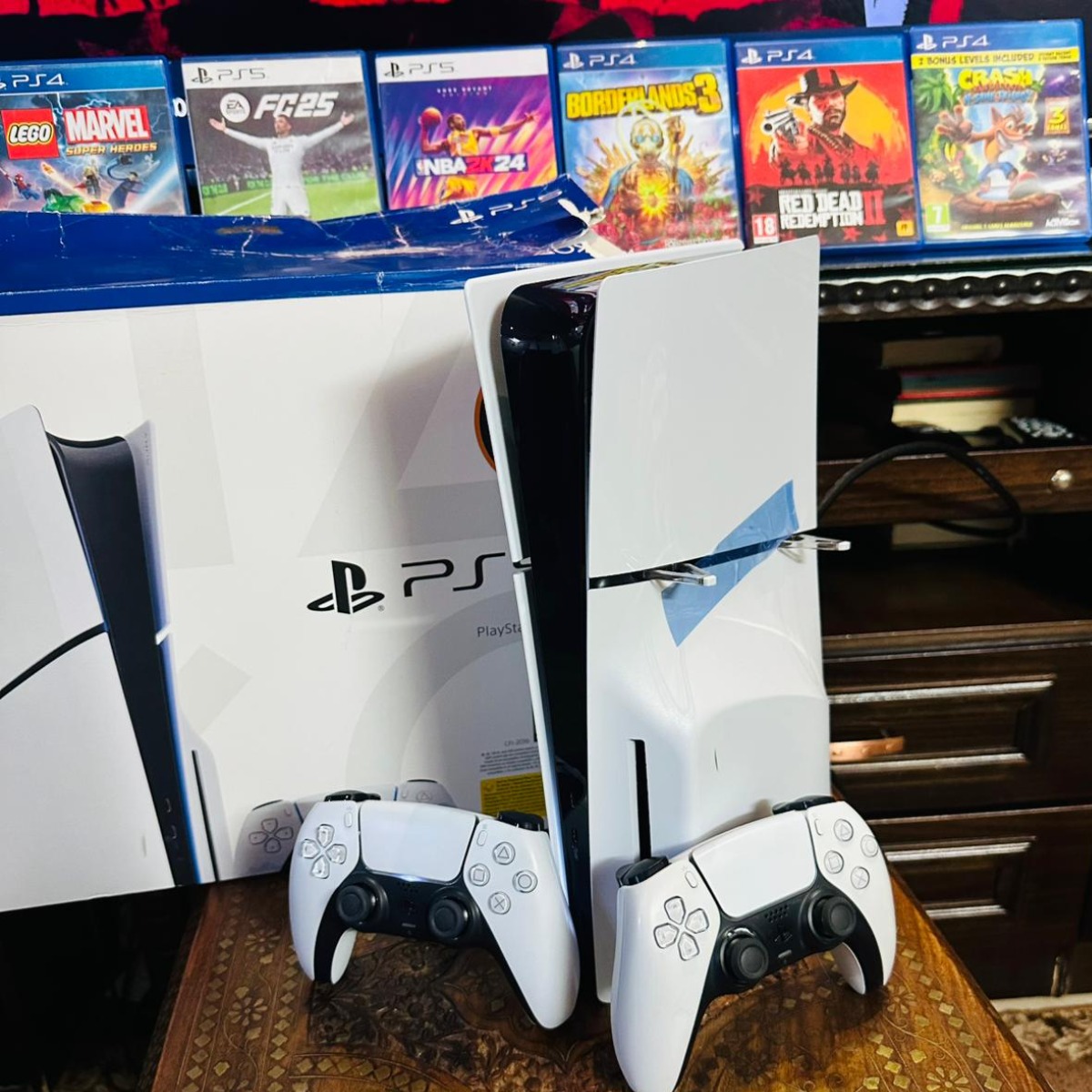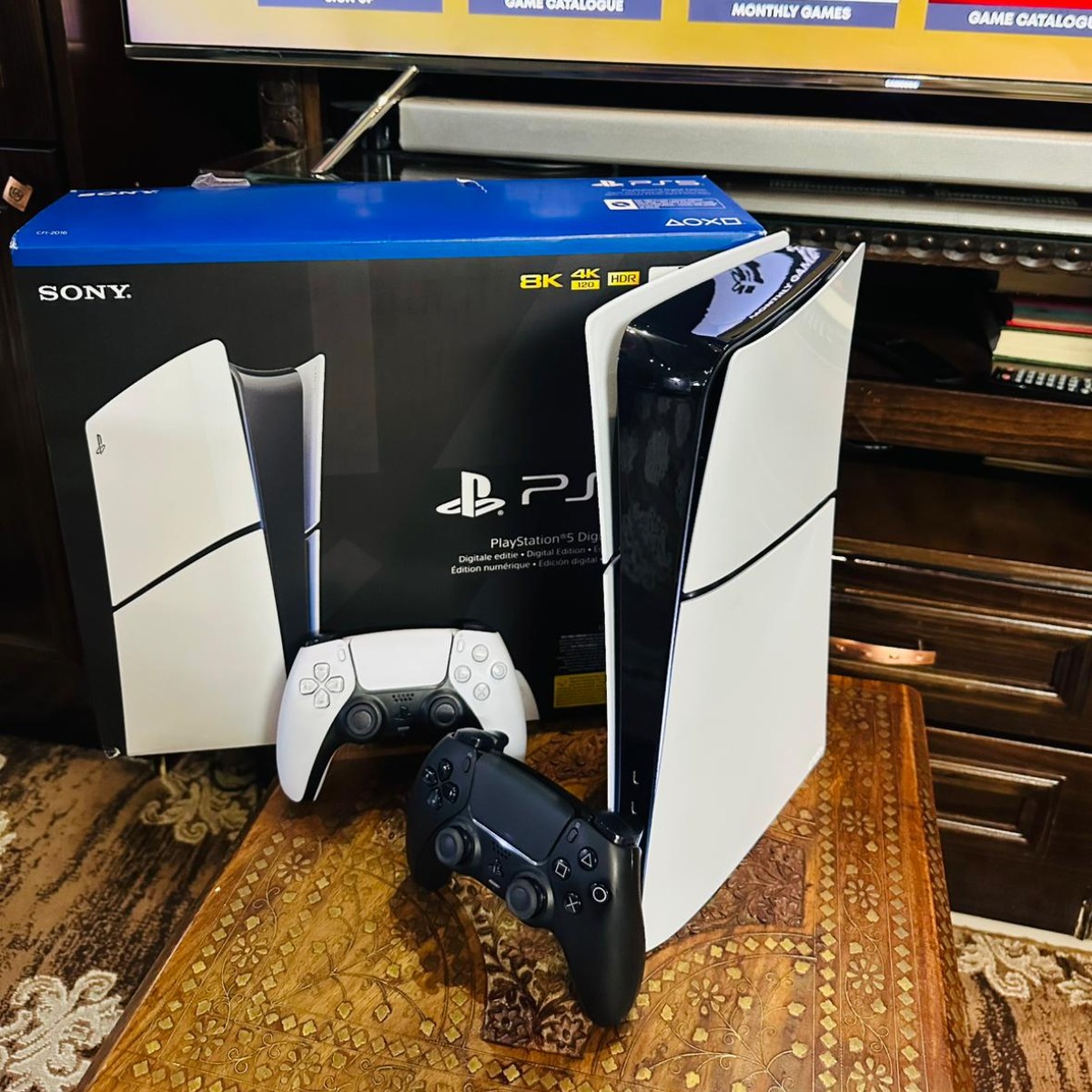 Playstation 5 Slim Blueray , 1TB , ايدتين أصليات , 6 سيديات العاب + العاب على نفس الجهاز , شبه جديدة غير مفتوحة أو مصلحة, شامل الكرتونة وجميع الكوابل الاصلية