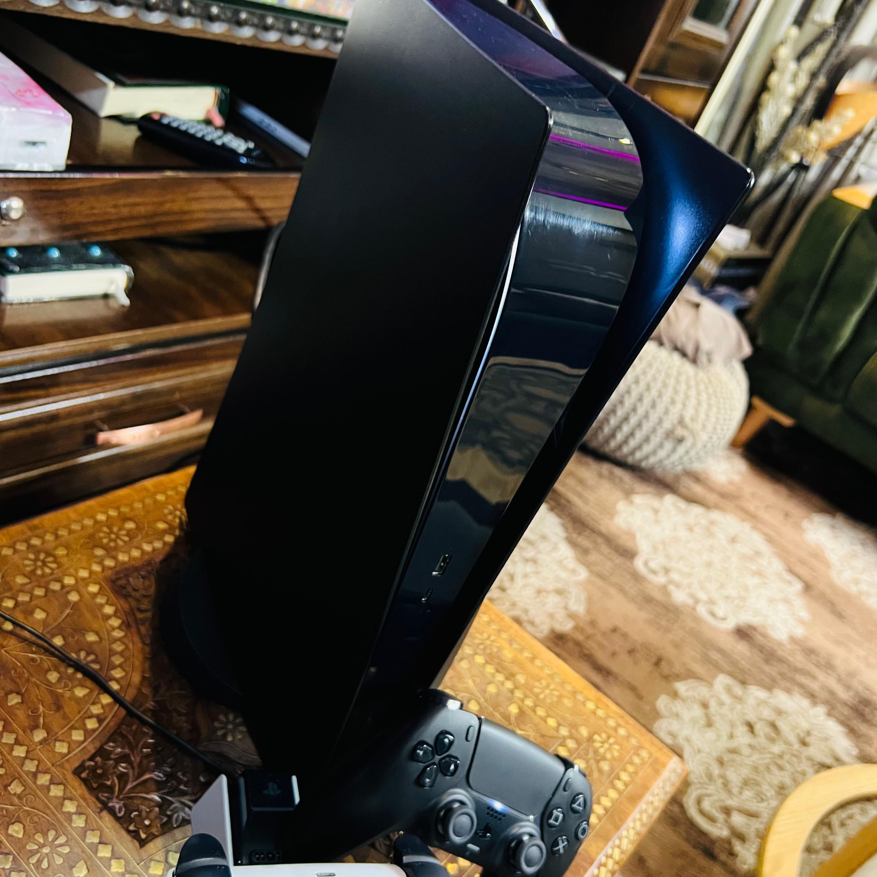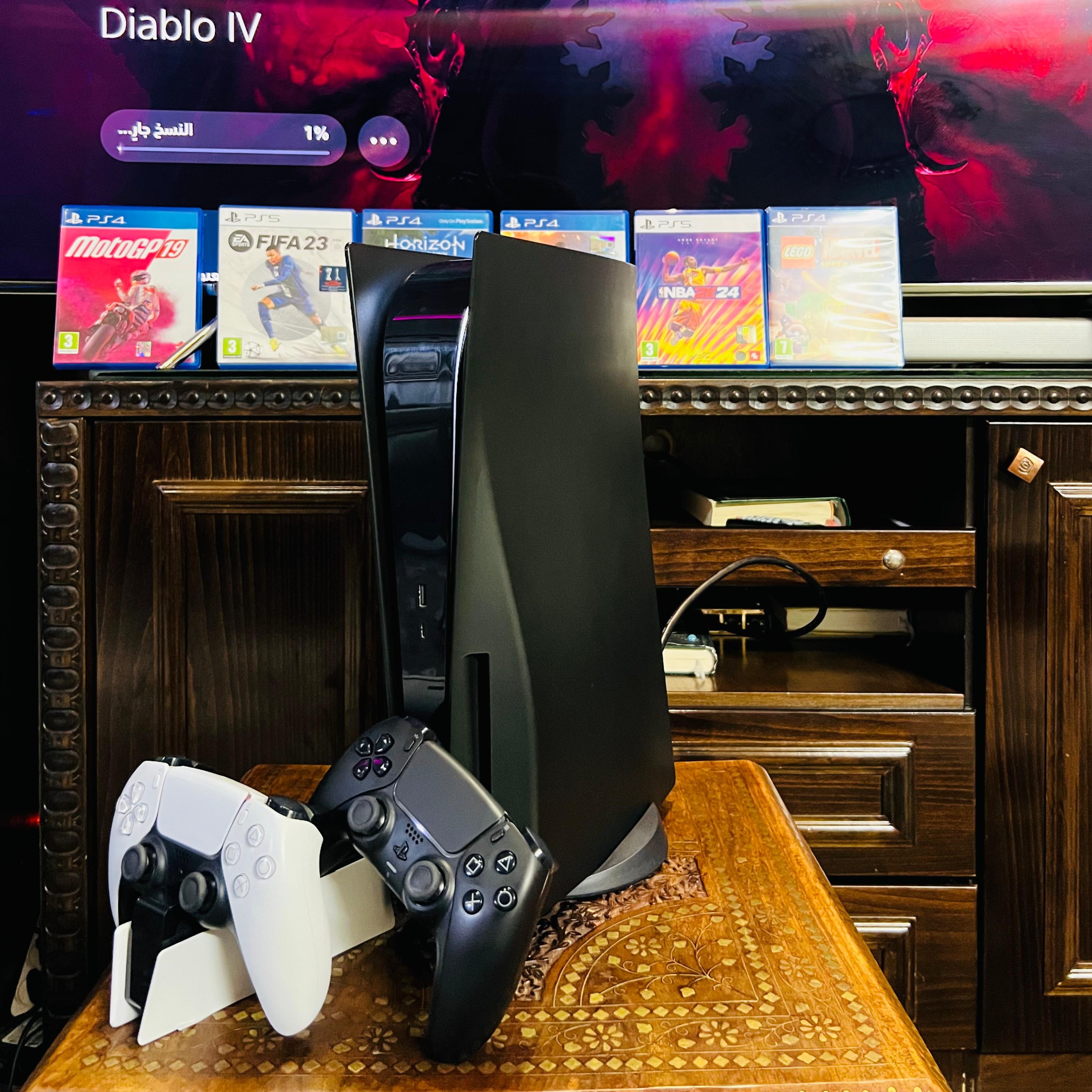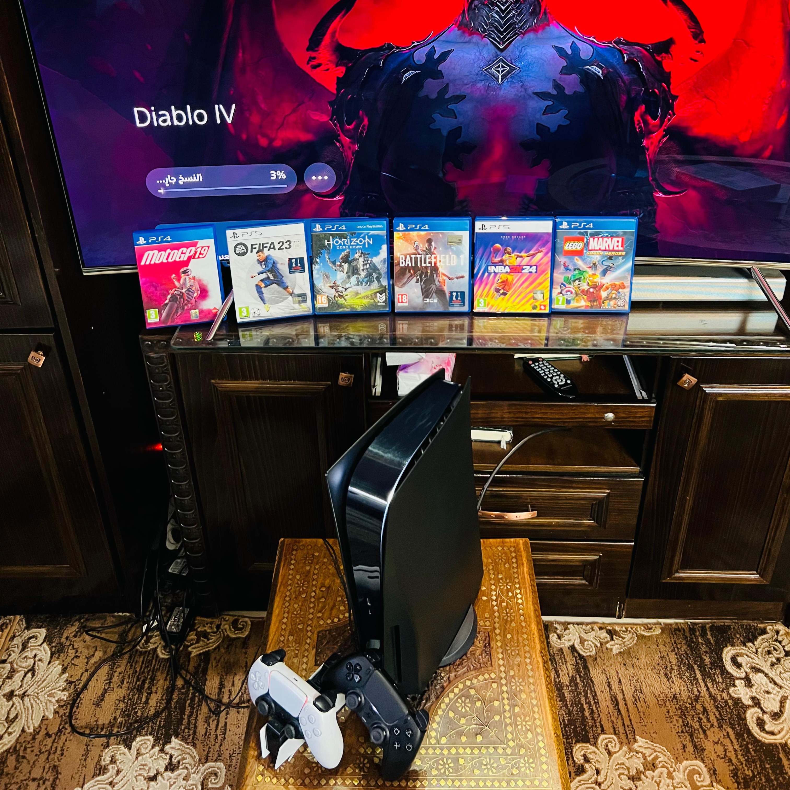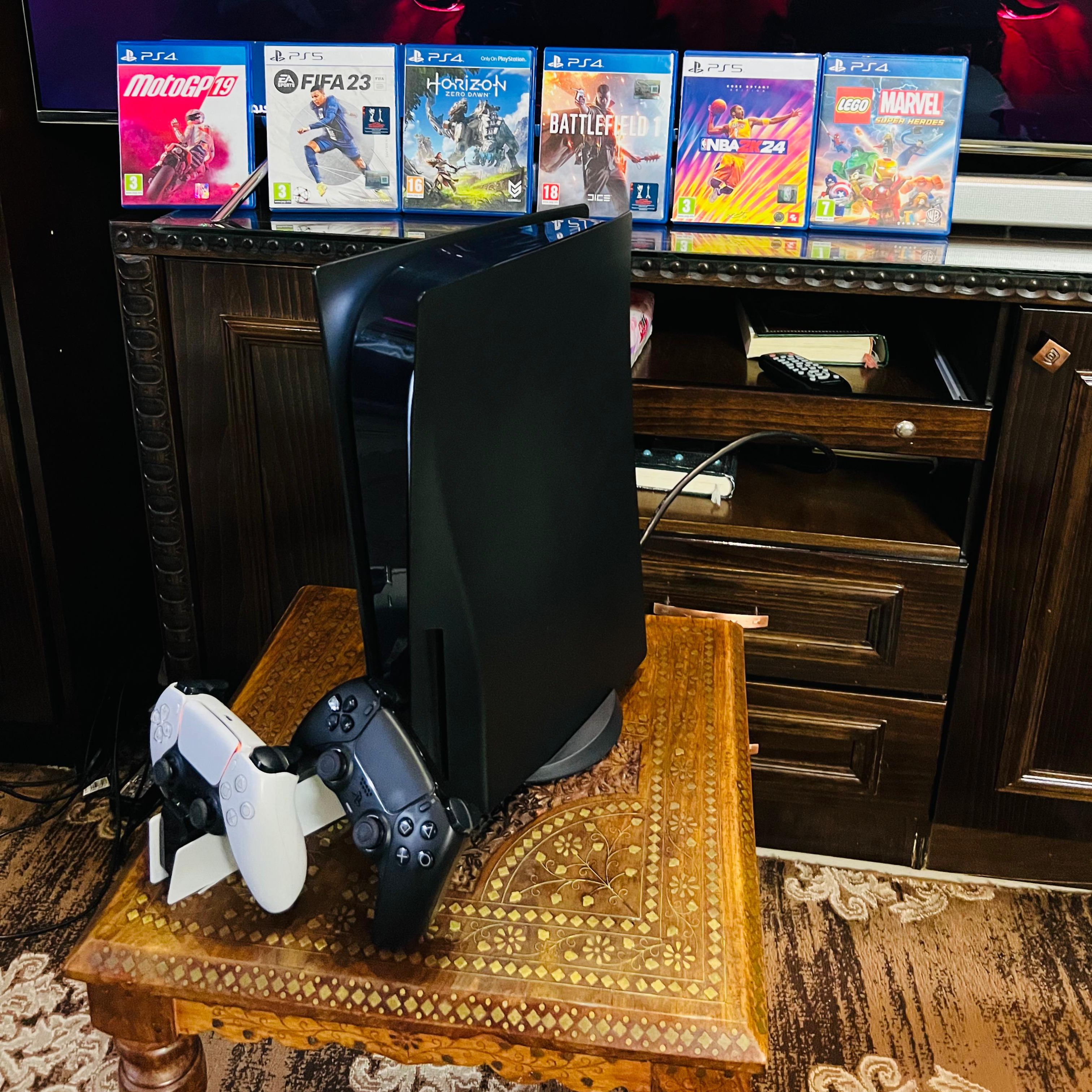 • Playstation 5 Fat Blueray | بلاستيشن 5 فات , 2TB تخزين اضافي M.2 Nvme Storge, ايدتين أصليات + قاعدة شحن أصلية, 7 سيديات العاب مميزة , كفر اسود مميز , شبه جديد غير مفتوح أو مصلح