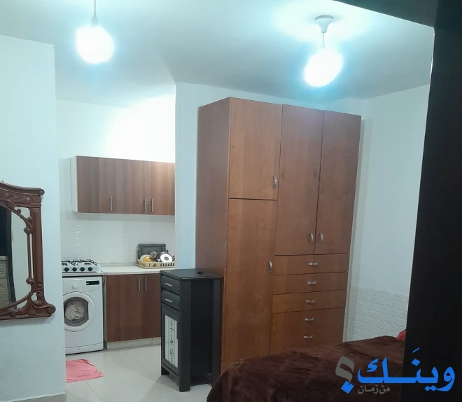 • ستوديو مفروش للايجار بمنطقة عين منجد مكون من غرفة ومطبخ وحمام وبلكون.