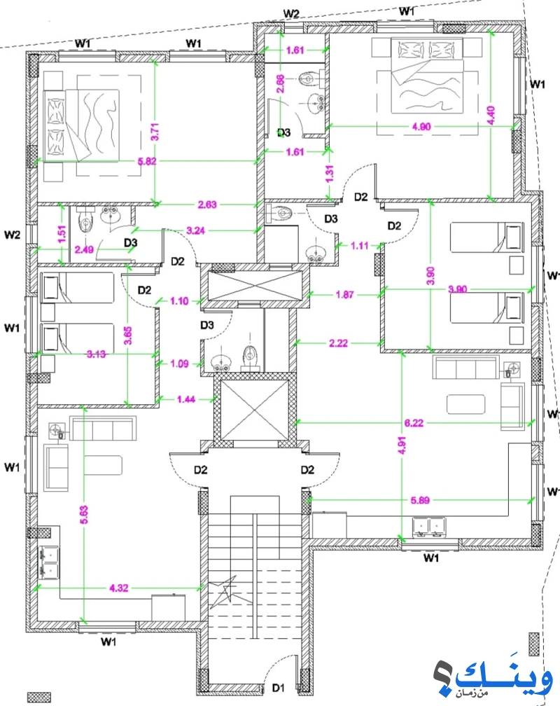 • شقه 105 متر داخلي (2غرف نوم، 2 حمام، مطبخ ، غرفة قعدة) مدخل خاص ومدخل من العمارة لكل شقه.