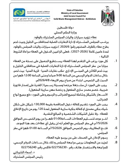 يرغب المجلس المشترك لإدارة النفايات الصلبة لمحافظتي الخليل وبيت لحم بطرح عطاء بالظرف المختوم رقم ( 2026/6 ) تزويد سيارات واليات المجلس بالوقود لمدة عامين كاملاً (2026-2027) ، فعلى الراغبين الدخول في العطاء مراعاة الشروط التالية :