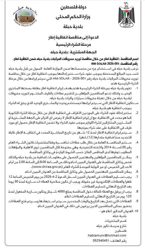 تقوم بلدية حبله بمرحلة الشراء الرئيسية هذه بهدف إبرام اتفاقية اطار مغلقة بصفتها المشتري الوحيد ولذلك تدعو المناقصين المؤهلين لتقديم عطاءات بالظرف المختوم لتوريد محروقات البلدية حبله من خلال تعبئة محروقات سيارات واليات بلدية حبله. ستكون اتفاقية الاطار التي سيتم ابرامها بمستخدم وحيد والمشتري الوحيد الذي يحق له الشراء بموجب اتفاقية هو بلدية حبله.