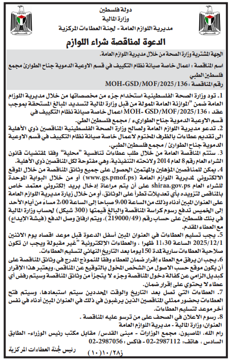- تدعو مديرية اللوازم العامة ولصالح وزارة الصحة الفلسطينية المناقصين ذوي الأهلية الى تقديم عطاءات بالظرف المختوم لاعمال خاصة صيانة نظام التكييف في قسم الاوعية الدموية جناح الطوارئ / مجمع فلسطين الطبي.