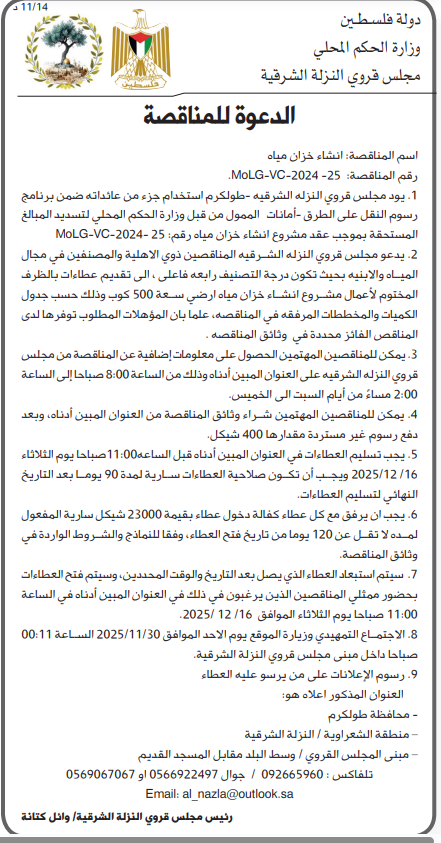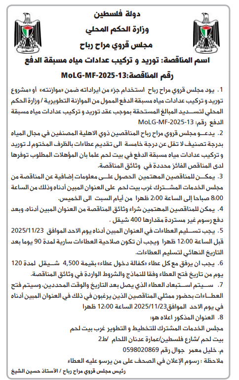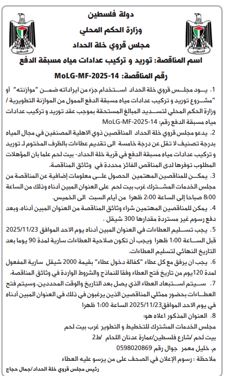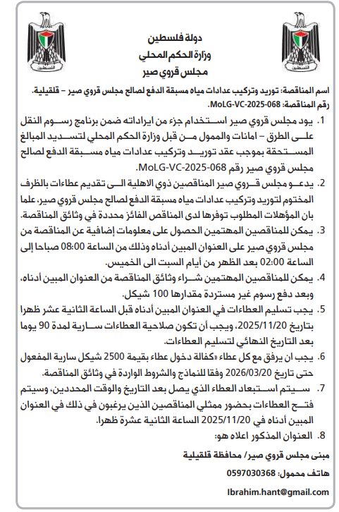 اسم المناقصة : توريد وتركيب عدادات مياه مسبقة الدفع لصالح مجلس قروي صير -قلقيلية رقم المناقصة : 068-2025-MoLG-VC. .