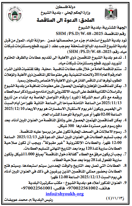 تود بلدية الشيوخ استخدام جزء من مخصصاتها ضمن موازنة المياه الممول من قبل بلدية الشيوخ لتسديد المبالغ المستحقة بموجب عقد ( توريد قطع ومستلزمات شبكات مياه، رقم: 2025 - 48.SHM /PS.D/W)
