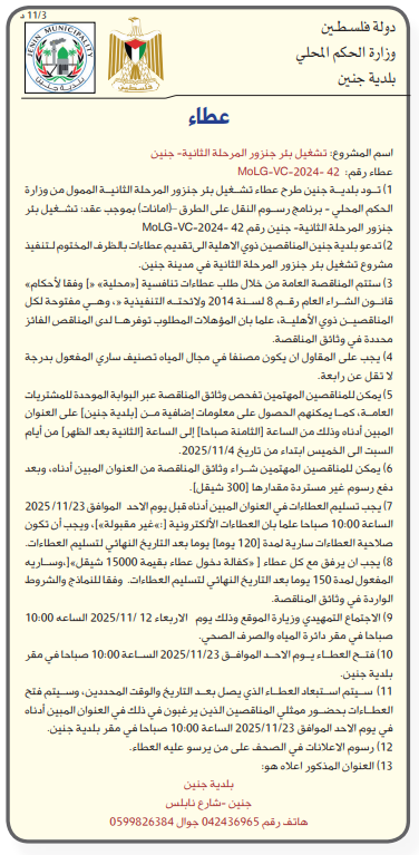 (1) تود بلدية جنين طرح عطاء تشغيل بئر جنزور المرحلة الثانية الممول من وزارة الحكم المحلي - برنامج رسوم النقل على الطرق - (امانات) بموجب عقد: تشغيل بئر جنزور المرحلة الثانية - جنين رقم 202442-MoLG-VC (2)