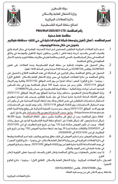 اسم المناقصه : أعمال تأهيل وتوسعة شبكة المياه الداخلية في حي اكتابا- محافظة طولكرم