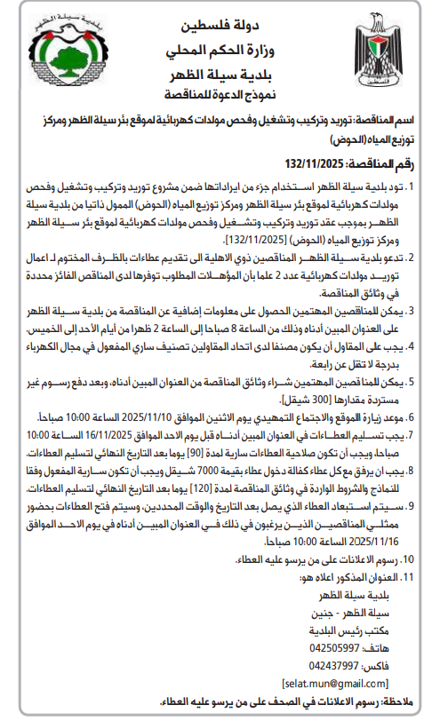 (10) فتح العطاء يوم الاحد الموافق 2025/11/23 الساعة 10:00 صباحا في مقر بلدية جنين.