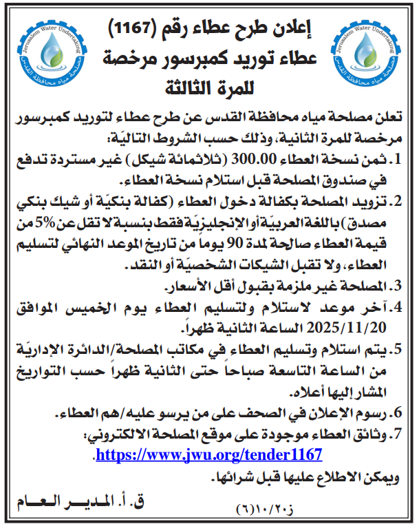 تعلن مصلحة مياه محافظة القدس عن طرح عطاء لتوريد كمبرسور مرخصة للمرة الثانية، وذلك حسب الشروط التالية: