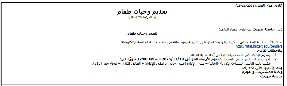 وذلك وفقًا لكراسة العطاء التي يمكن تنزيلها والاطلاع على شروطه ومواصفاته من خلال صفحة الجامعة الإلكترونية: http://ritaj.birzeit.edu/tenders ملاحظات هامة: 1. رسوم الإعلان في الصحف يتحملها من يُحال عليه العطاء. 2. آخر موعد لتسليم عروض الأسعار هو يوم الأربعاء الموافق 19/11/2025 الساعة 12:00 ظهرًا، في: وتفضلوا بقبول فائق الاحترام، وحدة المشتريات واللوازم