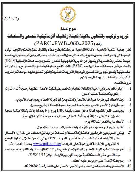 تعلن جمعية التنمية الزراعية الإغاثة الزراعية، عن رغبتها بطرح عطاء بالظرف المغلق والمختوم لتوريد البنود الموصوفة في وثائق العطاء ضمن مشروع زيادة منافع عمل النساء والشباب وصغار المزارعين كرواد تغير في سلسلة القيمة للخضراوات الطازجة وبتمويل من المديرية البلجيكية للتعاون التنموي والمساعدات الإنسانية (DGD) والمنفذ من قبل جمعية التنمية الزراعية (PARC) بالشراكة مع منظمة اوكسفام وبالتنسيق مع وزارة الزراعة الفلسطينية وتدعو الموردين المتخصصين في مجال التوريدات المطلوبة والذين تنطبق عليهم المواصفات والشروط المذكورة أدناه للتقدم التوريد الى طولكرم