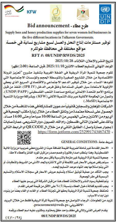 يقدم العرض الفني والمالي في مغلف واحد مغلق ومختوم، ومكتوب عليه اسم العطاء ورقمه 08/UNDP/RWDS/2025
