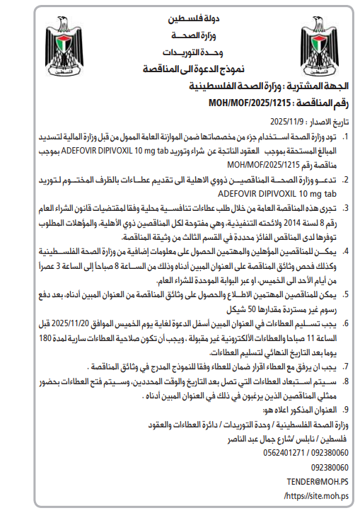 1 - تدعو وزارة الصحة المناقصين ذوي الأهلية الى تقديم عطاءات بالظرف المختوم شراء وتوريد دواء BACLOFEN 25MG TAB خاص بوزارة الصحة