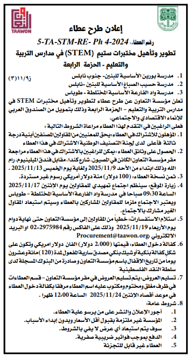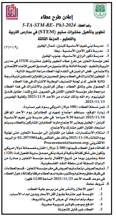 تعلن مؤسسة التعاون عن طرح عطاء لتطوير وتأهيل مختبرات STEM في مدارس التربية والتعليم - الحزمة الثالثة، وذلك بتمويل من الصندوق العربي للإنماء الاقتصادي والاجتماعي. فعلى الراغبين في التقدم لهذا العطاء مراعاة الشروط التالية :