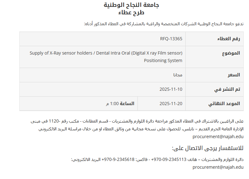 في حال وجود أي استفسار يرجى التواصل مع دائرة اللوازم والمشتريات هاتف رقم 2389685-02 تحويلة رقم 6400 أو من خلال البريد الإلكتروني [email protected]