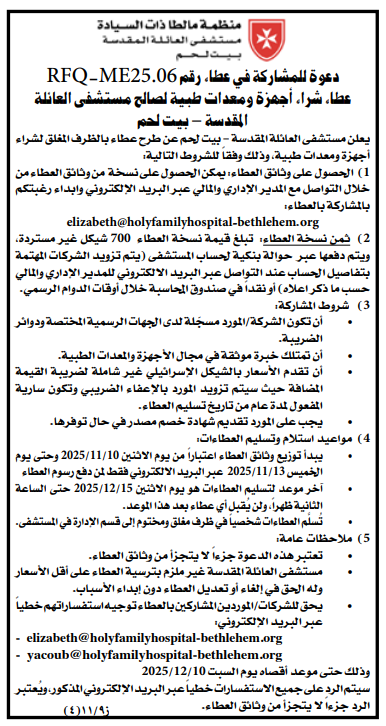 يعلن مستشفى العائلة المقدسة - بيت لحم عن طرح عطاء بالظرف المغلق لشراء أجهزة ومعدات طبية، وذلك وفقاً للشروط التالية: