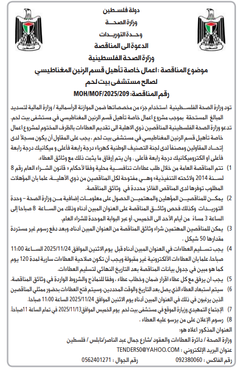 تود وزارة الصحة الفلسطينية استخدام جزء من مخصصاتها ضمن الموازنة الرأسمالية / وزارة المالية لتسديد المبالغ المستحقة بموجب مشروع اعمال خاصة تأهيل قسم الرنين المغناطيسي في مستشفى بيت لحم. تدعو وزارة الصحة الفلسطينية المناقصين ذوي الاهلية الى تقديم العطاءات بالظرف المختوم لمشروع اعمال خاصة تأهيل قسم الرنين المغناطيسي في مستشفى بيت لحم ، يجب على المقاول أن يكون مسجلاً لدى إتحاد المقاولين ومصنفاً لدى لجنة التصنيف الوطنية كهرباء درجة رابعة فأعلى و ميكانيك درجة رابعة فأعلى أو الكتروميكانيك درجة رابعة فأعلى . وان يتم إرفاق ما يثبت ذلك مع وثائق العطاء.