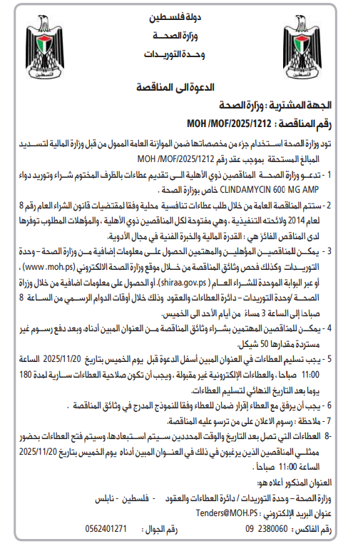 1 - تدعو وزارة الصحة المناقصين ذوي الأهلية الى تقديم عطاءات بالظرف المختوم شراء وتوريد دواء CLINDAMYCIN 600 MG AMP خاص بوزارة الصحة .