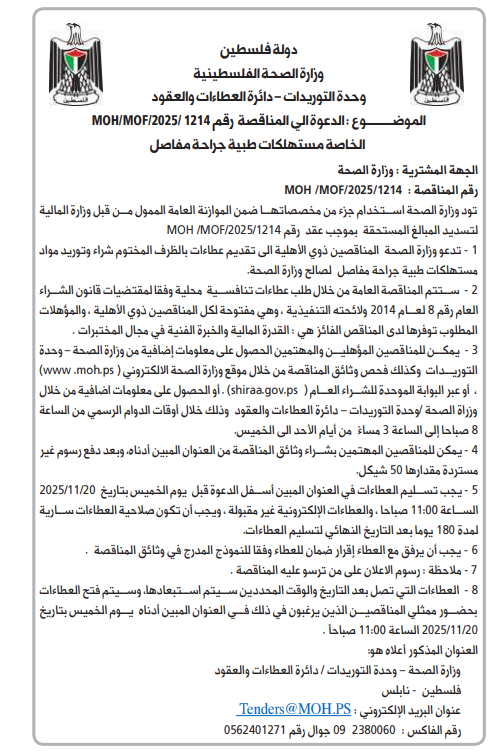 العنوان المذكور أعلاه هو: وزارة الصحة - وحدة التوريدات / دائرة العطاءات والعقود - فلسطين - نابلس عنوان البريد الإلكتروني : [email protected] رقم الفاكس : 2380060 09 رقم الجوال : 0562401271