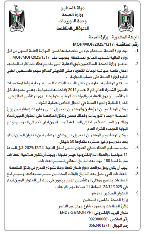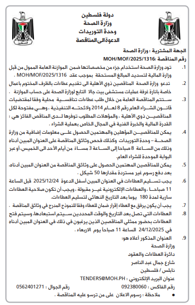 فعلى المعنيين بالمشاركة في هذا العطاء مراجعة مقر جمعية الاغاثة الطبية الفلسطينية - رام الله / البالوع مقابل مركز تسوق بلازا هاتف رقم (2969970) ، وذلك لإستلام قوائم الاجهزة والمواصفات المطلوبة وشروط العطاء مقابل مبلغ 100 شيكل غير مستردة وذلك اعتبارا من الساعة التاسعة من صباح يوم الثلاثاء 2025/12/16 وحتى الساعة الثانية من بعد ظهر يوم الخميس 2025/12/18