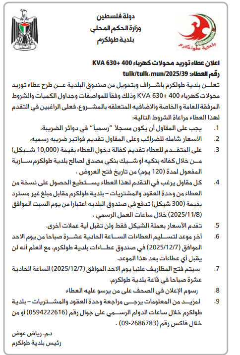 تعلن بلدية طولكرم باشراف وبتمويل من صندوق البلدية عن طرح عطاء توريد محولات كهرباء 400 630 KVA وذلك وفقاً للمواصفات وجداول الكميات والشروط المرفقة العامة والخاصة والاضافيه المتعلقه بالمشروع، فعلى الراغبين في التقدم لهذا العطاء مراعاة الشروط التالية: