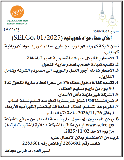 إعلان عطاء مواد كهربائية (01/2025 .SELCo)