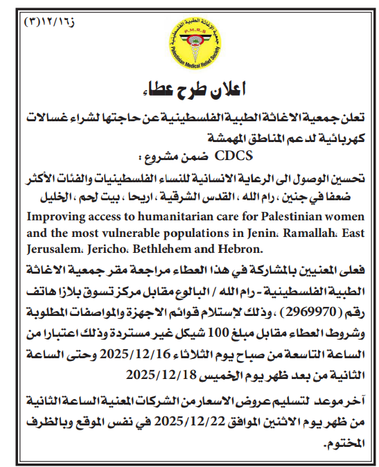 تعلن جمعية الاغاثة الطبية الفلسطينية عن حاجتها لشراء غسالات كهربائية لدعم المناطق المهمشة CDCS ضمن مشروع :