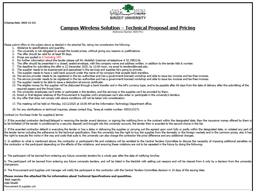 دائرة اللوازم والمشتريات – هاتف 2345113-09-970+ - فاكس: 2345618-9-970+ البريد الالكتروني: [email protected]