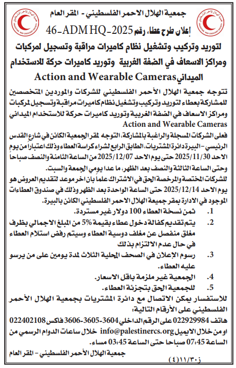 تتوجه جمعية الهلال الأحمر الفلسطيني للشركات والموردين المتخصصين للمشاركة بعطاء لتوريد وتركيب وتشغيل نظام كاميرات مراقبة وتسجيل المركبات ومراكز الاسعاف في الضفة الغربية وتوريد كاميرات حركة للاستخدام الميداني Action and Wearable Cameras