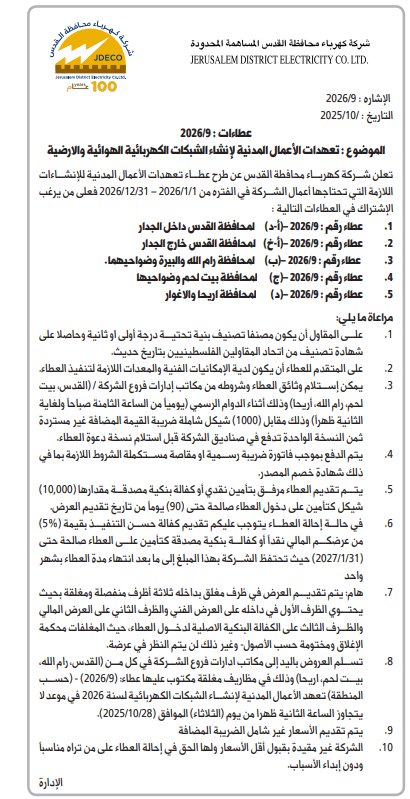 تعلن شركة كهرباء محافظة القدس عن طرح عطاء تعهدات الأعمال المدنية للإنشاءات اللازمة التي تحتاجها أعمال الشركة في الفتره من 2026/1/1 - 2026/12/31 فعلى من يرغب الإشتراك في العطاءات التالية :