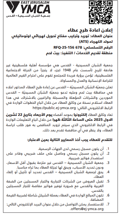 تعلن جمعية الشبان المسيحية - القدس عن إعادة طرح العطاء المذكور اعلاه في محافظة بيت لحم وعليه تدعو جمعية الشبان المسيحية – القدس الموردين والشركات المؤهلة والمسجلة والراغبين بالاشتراك في هذا العطاء استلام نسخة عن وثائق العطاء من خلال اتباع الخطوات الواردة في الرابط الالكتروني التالي: https://public.ej-ymca.org