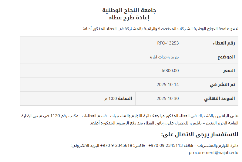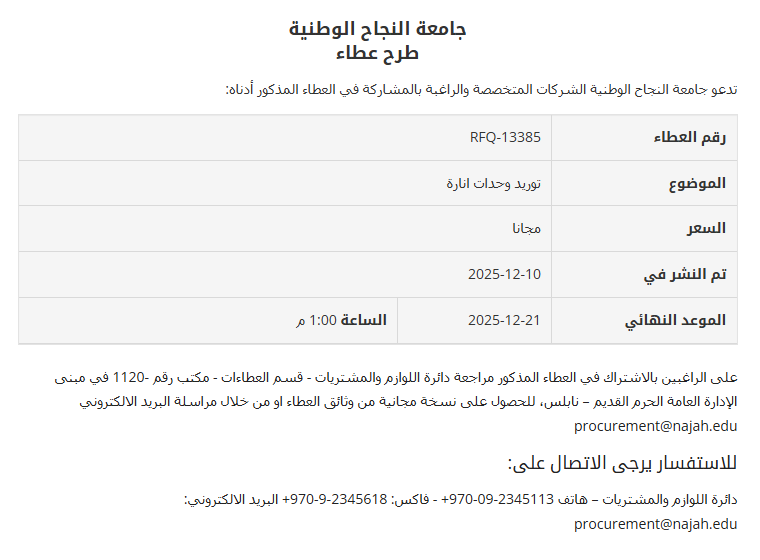 تدعو جامعة النجاح الوطنية الشركات المتخصصة والراغبة بالمشاركة في العطاء المذكور أدناه: