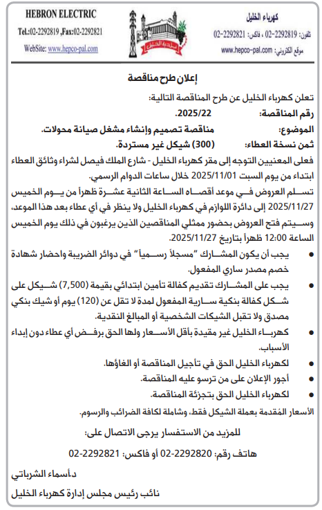 فعلى المعنيين التوجه إلى مقر كهرباء الخليل - شارع الملك فيصل لشراء وثائق العطاء ابتداء من يوم السبت 2025/11/01 خلال ساعات الدوام الرسمي.