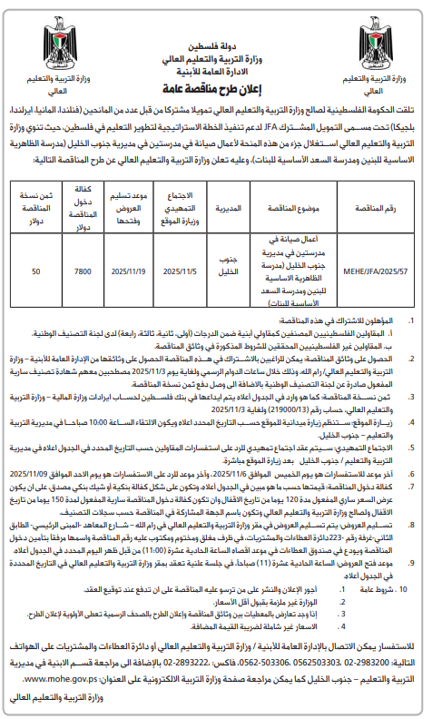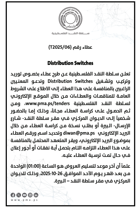 علماً أن آخر موعد لتسليم العروض هو الساعة (01:00) الواحدة من بعد ظهر يوم الأحد الموافق 26-10-2025، وذلك للديوان المركزي في مقر سلطة النقد – البيرة.