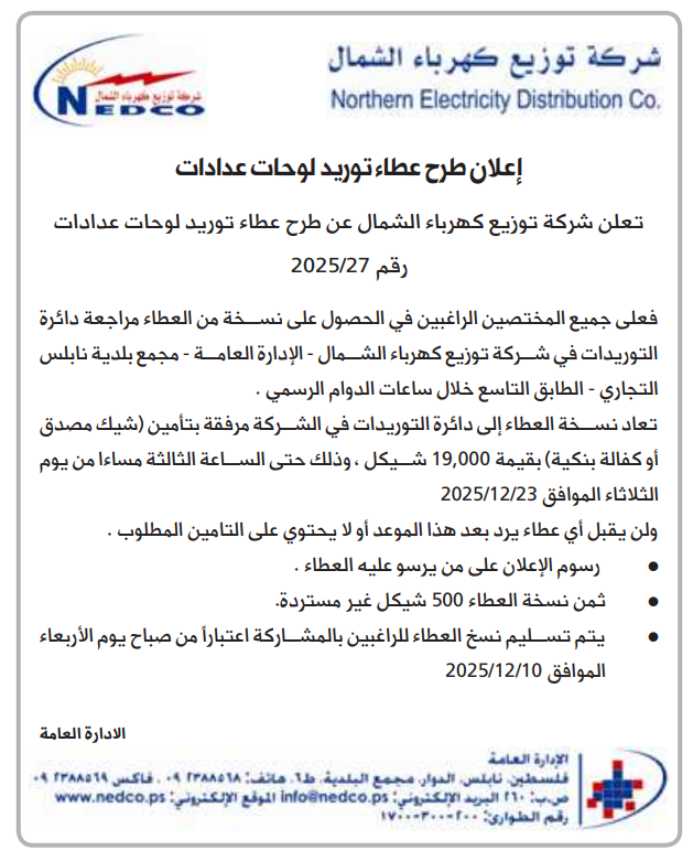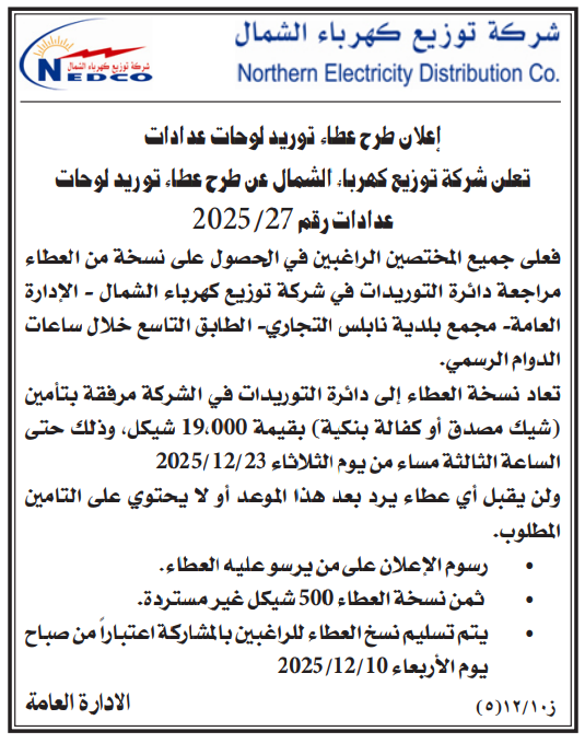 تعلن شركة توزيع كهرباء الشمال عن طرح عطاء توريد لوحات عدادات رقم 2025/27