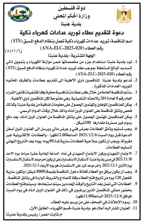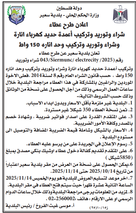 تعلن بلدية سعير عن طرح عطاء رقم (2025/ Siermunc/ electrecity/043 شراء وتوريد وتركيب أعمدة حديد كهرباء انارة وشراء وتوريد وتركيب وحد اناره 150 واط ، حسب قانون الشراء العام رقم 8 لسنة 2014 ، فعلى الاخوة الموردين والراغبين بالمشاركة في هذا العطاء مراجعة البلدية خلال ساعات العمل الرسمي وذلك من أجل الحصول على نسخة من الوثائق وذلك حسب الشروط التالية