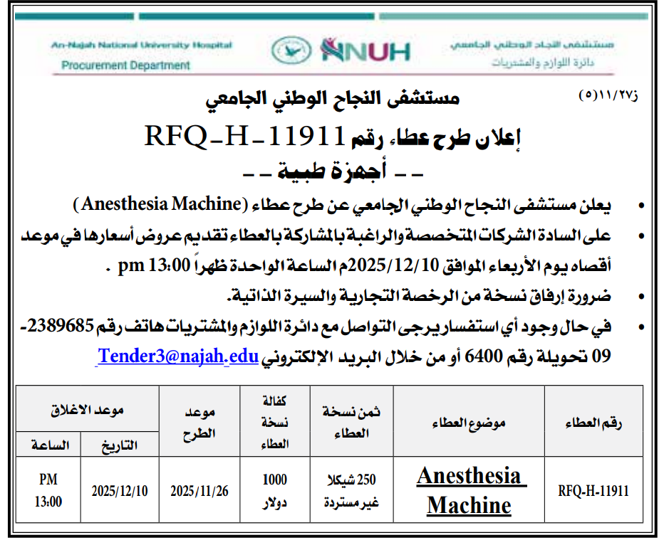 PM 2025/12/10 1000 2025/11/26 13:00 250 شيكلا غير مستردة دولار RFQ-H-11911 Anesthesia Machine