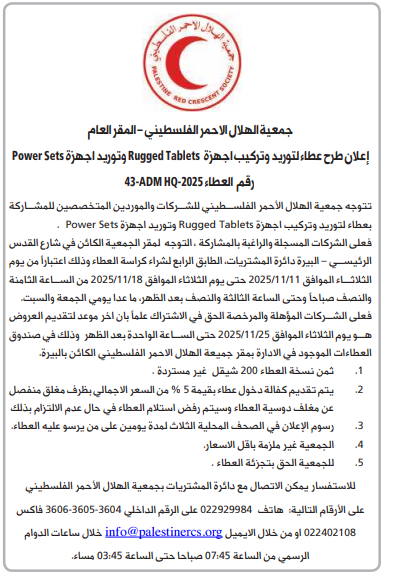 تتوجه جمعية الهلال الأحمر الفلسطيني للشركات والموردين المتخصصين للمشاركة - بعطاء لتوريد وتركيب اجهزة Rugged Tablets وتوريد اجهزة Power Sets . فعلى الشركات المسجلة والراغبة بالمشاركة ، التوجه لمقر الجمعية الكائن في شارع القدس الرئيسي - البيرة دائرة المشتريات الطابق الرابع لشراء كراسة العطاء وذلك اعتباراً من يوم الثلاثاء الموافق 2025/11/11 حتى يوم الثلاثاء الموافق 2025/11/18 من الساعة الثامنة والنصف صباحاً وحتى الساعة الثالثة والنصف بعد الظهر، ما عدا . يومي الجمعة والسبت. فعلى الشركات المؤهلة والمرخصة الحق في الاشتراك علماً بان اخر موعد لتقديم العروض هو يوم الثلاثاء الموافق 2025/11/25 حتى الساعة الواحدة بعد الظهر وذلك في صندوق العطاءات الموجود في الادارة بمقر جميعة الهلال الاحمر الفلسطيني الكائن بالبيرة.