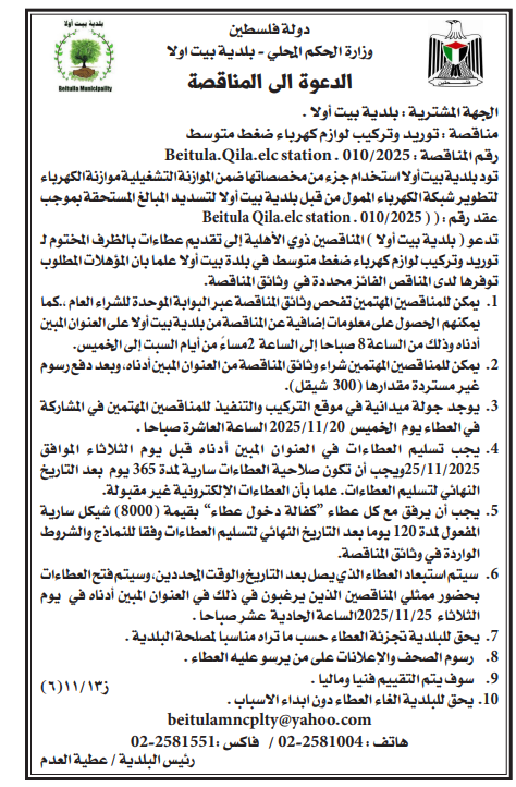 تدعو بلدية بيت أولا المناقصين ذوي الأهلية إلى تقديم عطاءات بالظرف المختوم لـ توريد وتركيب لوازم كهرباء ضغط متوسط في بلدة بيت أولا علما بان المؤهلات المطلوب توفرها لدى المناقص الفائز محددة في وثائق المناقصة.