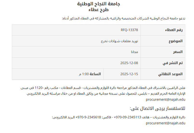 على الراغبين بالاشتراك في العطاء المذكور مراجعة دائرة اللوازم والمشتريات - قسم العطاءات - مكتب رقم -1120 في مبنى الإدارة العامة الحرم القديم – نابلس، للحصول على نسخة مجانية من وثائق العطاء او من خلال مراسلة البريد الالكتروني [email protected]