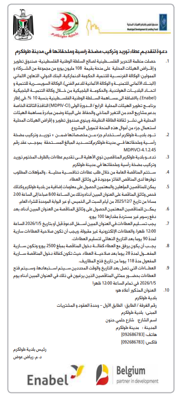 دعوة لتقديم عطاء توريد وتركيب مضخة راسية وملحقاتها في مدينة طولكرم