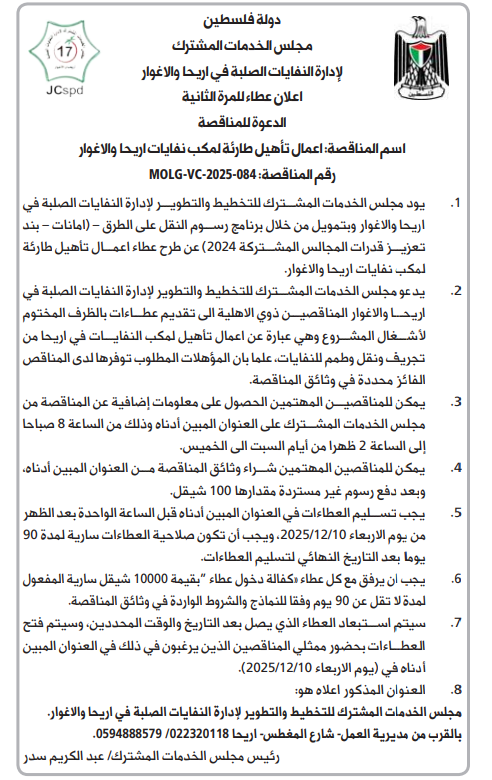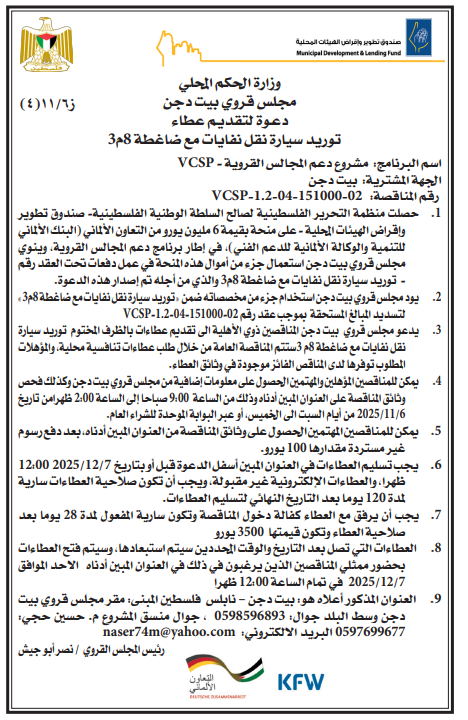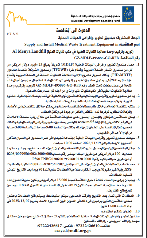 صندوق تطوير وإقراض الهيئات المحلية - دائرة العطاءات والمشتريات - طابق -2 شارع عين سمعان - مقابل مجمع رام الله الترويحي - رام الله - فلسطين هاتف: 97222426610+ فاكس : 97222426617+