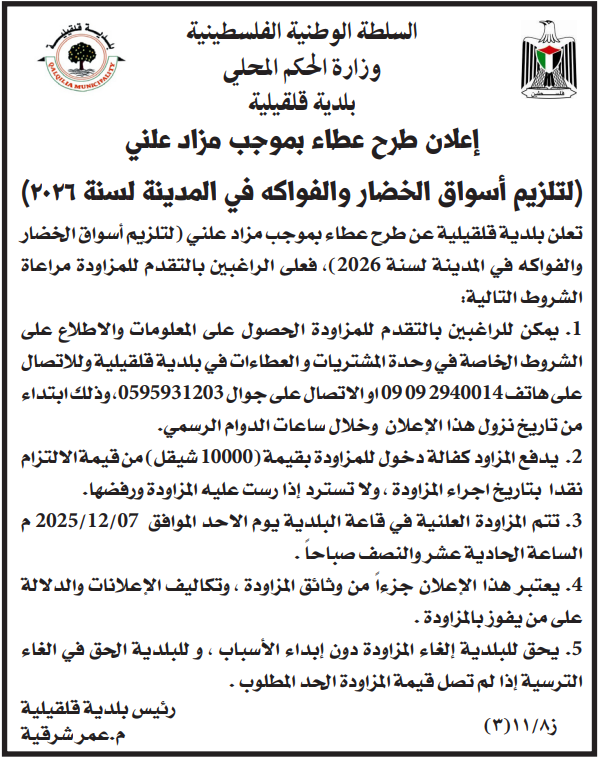 تعلن بلدية قلقيلية عن طرح عطاء بموجب مزاد علني لتلزيم أسواق الخضار والفواكه في المدينة لسنة 2026، فعلى الراغبين بالتقدم للمزاودة مراعاة الشروط التالية: