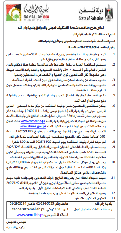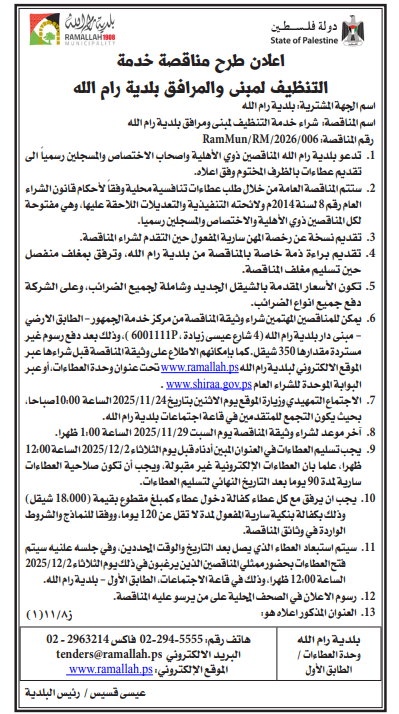 بلدية رام الله وحدة العطاءات /الطابق الأول هاتف رقم: 55555-24-02 فاكس 2963214 - 02 البريد الالكتروني [email protected] الموقع الإلكتروني: www.ramallah.ps