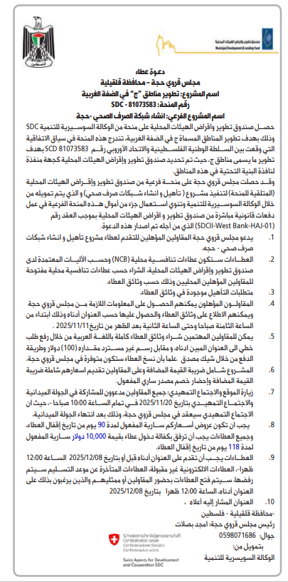 وقد حصلت مجلس قروي حجة على منحة فرعية من صندوق تطوير وإقراض الهيئات المحلية (المتلقية للمنحة) لتنفيذ مشروع ( تأهيل و انشاء شبكات صرف صحي) و الذي يتم تمويله من خلال الوكالة السوسيرية للتنمية وتنوي استعمال جزء من أموال هذه المنحة الفرعية في عمل دفعات قانونية مباشرة من صندوق تطوير و اقراض الهيئات المحلية بموجب العقد رقم (01-SCII-West Bank-HAJ الذي من أجله تم اصدار هذه الدعوة.