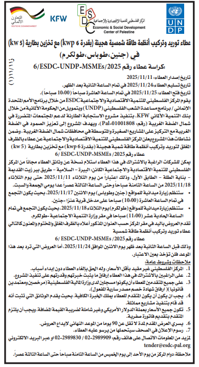 يقوم المركز الفلسطيني للتنمية الاقتصادية والاجتماعية ESDC من خلال برنامج الأمم المتحدة الإنمائي / برنامج مساعدة الشعب الفلسطيني (UNDP) وبتمويل من الحكومة الألمانية من خلال بنك التنمية الألماني KFW، بتنفيذ مشروع الاستجابة الطارئة لدعم المجتمعات المتضررة في شمال الضفة الغربية (رقم: 01001808-Pal)، ويهدف المشروع إلى تعزيز الصمود في الضفة الغربية مع التركيز على المشاريع الصغيرة والمتوسطة في محافظات شمال الضفة الغربية ، وضمن نشاطات هذا المشروع يعلن المركز الفلسطيني للتنمية الاقتصادية والاجتماعية عن عطاء بالظرف المغلق لتوريد وتركيب أنظمة طاقة شمية هجينة بقدرة 6 kwp مع تخزين بطارية (kw5)