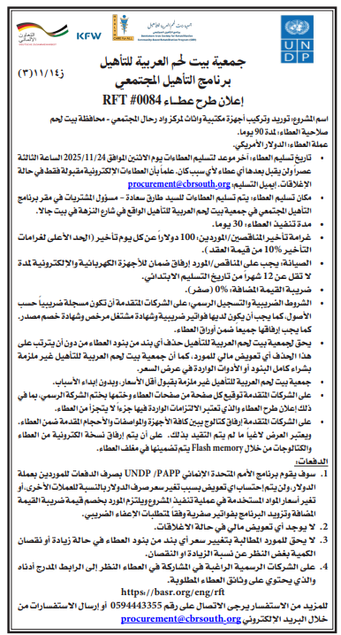 علماً أن كافة التفاصيل بخصوص شراء وتوريد وتركيب الأثاث والمستلزمات والاجهزة الكهربائية الخاصة بالسجن والتي يمكن لاي شركة ترغب بالحصول عليها من خلال مكتب الهيئة المستقلة لحقوق الانسان / رام الله / خلف المجلس التشريعي رقم هاتف 02/2986958 او 02/2960241 او عبر الموقع الالكتروني للهيئة ichr.ps، حتى يوم الأحد الموافق 23/11/2025