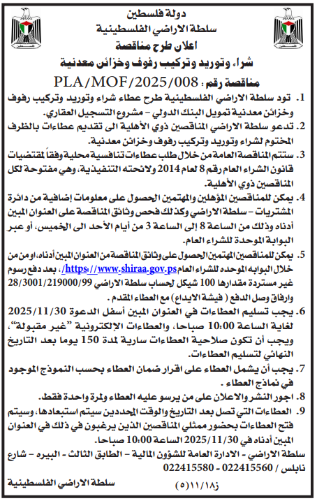 يمكن للمناقصين المهتمين الحصول على وثائق المناقصة من العنوان المبين أدناه، او من من خلال البوابه الموحدة للشراء العام https://www.shiraa.gov.ps/ ، بعد دفع رسوم غير مستردة مقدارها 100 شيكل لحساب سلطة الاراضي وارفاق وصل الدفع ( فيشة الايداع (مع العطاء المقدم . يجب تسليم العطاءات في العنوان المبين أسفل الدعوه 2025\11\19 لغاية الساعه 12:00 ، والعطاءات الإلكترونية (غير مقبولة ) ويجب أن تكون صلاحية العطاءات سارية لمدة (150) يوما بعد التاريخ النهائي لتسليم العطاءات.
