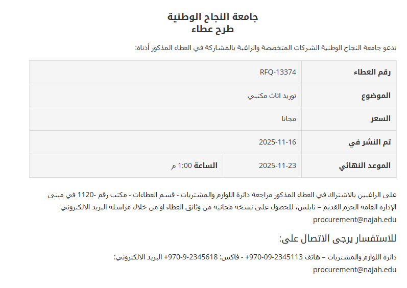 على الراغبين بالاشتراك في العطاء المذكور مراجعة دائرة اللوازم والمشتريات - قسم العطاءات - مكتب رقم -1120 في مبنى الإدارة العامة الحرم القديم – نابلس، للحصول على نسخة مجانية من وثائق العطاء او من خلال مراسلة البريد الالكتروني [email protected]